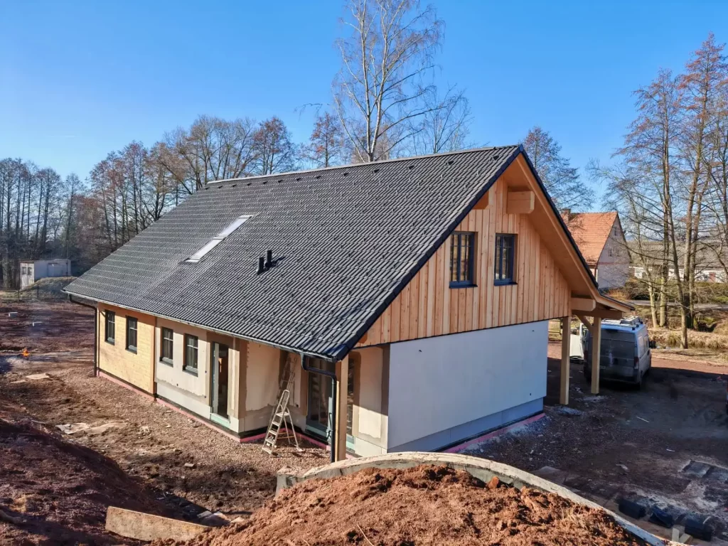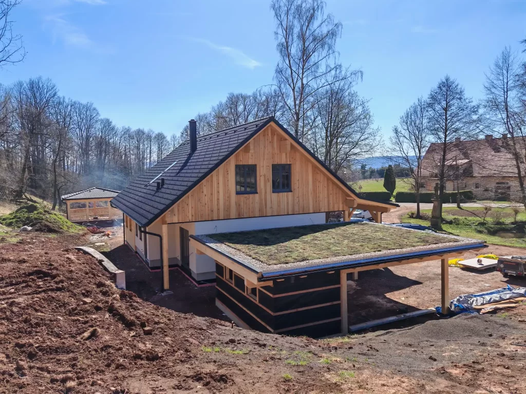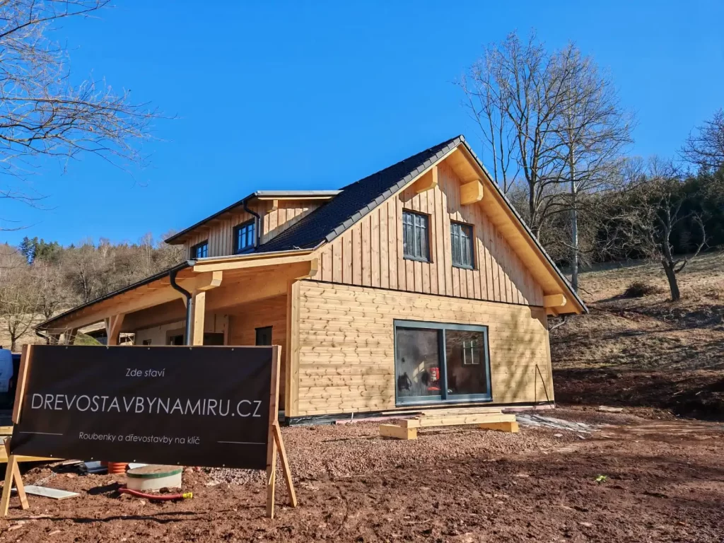 Pozemek darovaný od rodičů, za podmínky, že zde obdarovaní zde postaví dům. Jsme moc rádi, že jsme byli osloveni a mohli jsme navrhnout na Broumovsku poloroubenku s naším rukopisem. Návrh, který byl takříkajíc na „první dobrou“, sedl jak majitelům, tak místu s duší dávnou. Taková roubená stylovka, kterou musíte po dokončení navštívit i Vy, jelikož bude nabízet krátkodobé ubytování všem zájemcům, kteří do těchto končin zavítají… Barevná okna v kombinaci dřeva a světlé fasády, jasně daná forma stavby, koupací jezírko v nově založené zahradě propojující ostatní doplňkové stavby. Poloroubená pohádka na tomto světě.
